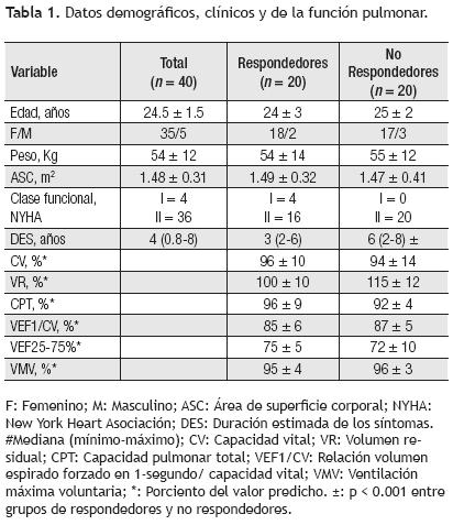 Características clínicas: No se observaron diferencias en cuanto a la edad, distribución por género, peso y área de superficie corporal entre ambas cohortes. La duración estimada de los síntomas fue más corta para los respondedores al compararse con el grupo no respondedor. De acuerdo a la clasificación funcional de la NYHA/WHO, hubo más enfermos en clase funcional II que en la I (Tabla 1).