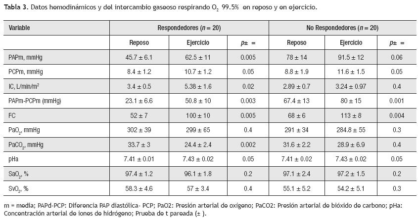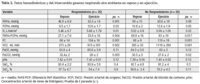 Análisis de los datos: Se analizaron las características clínicas y de la función pulmonar para toda la población y de manera separada para la cohorte de acuerdo al criterio de ser respondedor o no. Los resultados hemodinámicos consignados de cada una de las maniobras de reposoejercicio representan el promedio de "tres registros" con menos de 10% de variación en cada una de ellas.