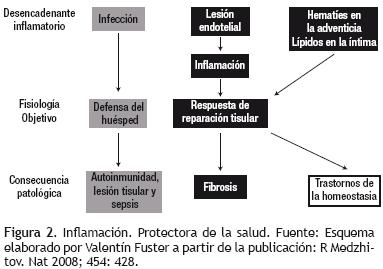 No cabe ya duda de que, al hablar de la aterotrombosis, estamos hablando de una enfermedad inflamatoria. Aunque en el organismo humano la inflamación propiamente dicha sea tan sólo un mecanismo defensivo, a menudo para neutralizar la infección de bacterias (Figura 2), en la enfermedad aterotrombótica el proceso inflamatorio es una reacción de defensa a tres cuerpos extraños, y bien es deficitario o bien es excesivo o tóxico. En otras palabras, la arteria no reconoce de forma fisiológica o basal estos elementos extraños y, cuando aparecen, se pone en marcha un proceso inflamatorio, que en el caso de la aterotrombosis es imperfecto, porque o bien es insuficiente o es demasiado activo, o bien decide "suicidarse" por considerar que hay demasiado sustrato extraño y se considera incapaz de gestionar ese proceso. Todo ello se sospechaba, pero lo hemos podido comprobar en los últimos años gracias al avance de las técnicas de imagen.