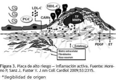 c) Colesterol LDL depositado (Figura 3). Tras los dos procesos anteriormente explicados, se pone en marcha el mecanismo por el que el tercer cuerpo extraño, el colesterol LDL o "colesterol malo" depositado en la pared arterial atrae a los monocitos, que penetran en la pared y lo transfieren al colesterol HDL o "colesterol bueno", también favoreciendo su salida. Éste es el proceso que explica cómo el colesterol HDL elevado en sangre puede ejercer, hasta cierto punto, un grado de prevención de la enfermedad cardiovascular. El problema que encontramos aquí no es que el proceso inflamatorio sea excesivo, y la célula blanca o monocito decida claudicar, puesto que encuentra tanto sustrato extraño que ya no inicia la lucha, entrando en una fase de muerte celular lenta denominada apoptosis. Esta situación es realmente delicada porque la apoptosis va acompañada de la generación de factor tisular, de tal manera que si la placa vulnerable se rompe en la luz vascular, la sangre circulante y el sistema de coagulación se encuentran con el factor tisular y la arteria se ocluye por un trombo agudo, sobreviniendo el infarto de miocardio. La pregunta es si el proceso celular de defensa, apoyándose en un aumento del HDL o "colesterol bueno", consigue reducir la población de células que entran en apoptosis. En verdad, cuando semanalmente inyectamos HDL humano, en la forma de Apo A1, en conejos que padecen aterosclerosis la regresión de células inflamatorias de la placa de ateroma tiene lugar en menos de cuatro semanas. Este es un tiempo mucho más corto que la reducción del depósito del colesterol LDL por la administración de estatinas. No cabe duda de que el objetivo futuro debe ser cómo conseguir aumentar el nivel del colesterol HDL en el humano.