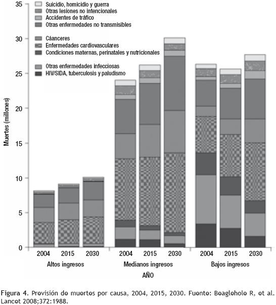 a) Conocimiento. Desde el punto de vista epidemiológico, la importancia de la patología cardiovascular queda fuera de toda duda, mostrándose como la principal causa de mortalidad (Figura 4) tanto en países desarrollados como, de forma progresiva, en países menos desarrollados o con economías intermedias. Esto es en parte debido al alto consumo de hidratos de carbono (que llevan a la obesidad con sus consecuencias) ya que son más baratos, a la conservación de los alimentos con sal (lo que conduce a la hipertensión), y a que las empresas tabacaleras están afincándose en estos países. Además, globalmente, se predice que la prevalencia de enfermedad cardiovascular va a aumentar (Figura 5). Esto debido a la presente epidemia de obesidad y sus consecuencias como son la diabetes, alteraciones del colesterol (aumento del LDL y disminución del HDL) y la hipertensión.