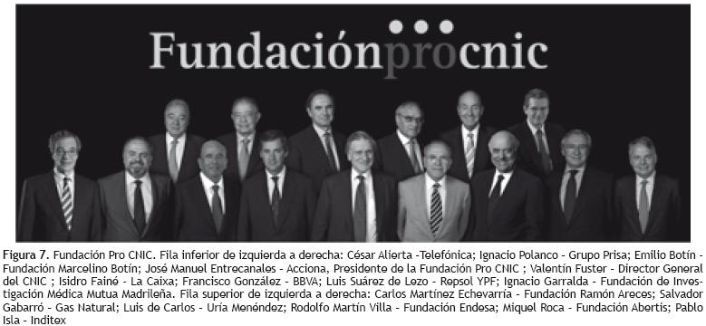 Poco después de la firma del acuerdo, el 24 de enero de 2006, este grupo de compañías constituyó oficialmente la Fundación Pro CNIC. Desde entonces se han unido nuevas compañías y la Fundación Pro CNIC tiene actualmente 13 miembros que han renovado el acuerdo recientemente (Figura 7): Acciona, Banco Santander, BBVA, Endesa, Fundación Abertis, Fundación Ramón Areces, Gas Natural, Grupo Prisa, Inditex, La Caixa, Repsol YPF, Fundación de Investigación Mutua Madrileña y Telefónica. Este Fundación aporta financiación adicional que puede invertirse en áreas a las que la financiación pública no puede llegar. Por ejemplo, programas especiales para el descubrimiento y formación de jóvenes investigadores, becas externas dirigidas a integrar la investigación básica y clínica para responder a cuestiones específicas, adquisición de equipos de investigación especiales que de otra forma serían difíciles de financiar y programas para incentivar y conservar a valiosos investigadores.