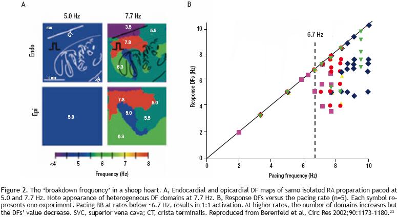 Figure 2 shows results of optical mapping experiments and DF analysis in the isolated RA of a sheep heart addressing the mechanism underlying of such lack of 1:1 inputoutput relationship. The preparation was subjected to periodic pacing through a bipolar electrode on Bachmann's Bundle (BB) to simulate activity arriving from a periodic LA source across BB into the RA.23 As shown in panel A, stimulation at 5.0 Hz resulted in 1:1 activation of the entire right atrium and thus the output DF was also 5.0 Hz everywhere on the endocardial and epicardial surfaces. However, at 7.7 Hz, propagation into the RA was no longer 1:1. Instead, a heterogeneous distribution of DF domains was established both in the endocardium and the epicardium, with frequencies ranging between 3.5 and 7.7 Hz. Composite data from five experiments are presented in panel B. The DFs measured on the endocardium, are plotted as a function of the pacing frequency. Clearly, below 6.7 Hz the response DF showed no dispersion in any of the experiments, which meant that activation was 1:1 everywhere in the RA. Above the 'breakdown frequency' of 6.7 Hz, there was a large DF dispersion manifested as multiple domains whose individual frequencies were either equal or lower than the pacing frequency. In addition, we found that intermittent blocks occur primarily at branching sites of the pectinate bundles of the atria. Those structurally related blockades lead to a significant loss of consistency in the beattobeat direction of wave propagation and provided a direct explanation for the difficulty in tracing back the origin of the activation during fibrillatory conduction.23 We also found that the spatial distribution of action potential duration at a low pacing rate of 3.3 Hz was different from the distribution of DF domains, which led us to suggest that dispersion of refractoriness at normal frequencies is a poor predictor of the spatial distribution of intermittent block patterns that characterize AF outside the source region.23