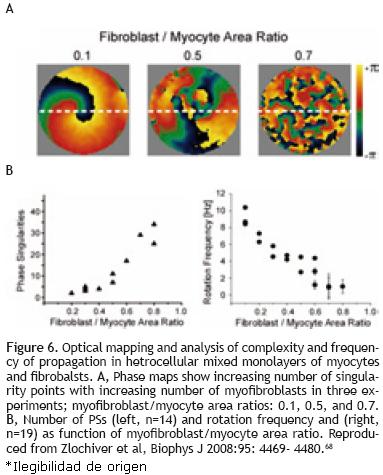 To characterize the effect of fibrosis separately from electrical and other structural remodeling in the myocardium we studied patterns of propagation in monolayers cultured with varying ratios in myocytes and myofibroblasts.68 The number of myofibroblasts in the cocultures significantly modified the spatiotemporal characteristics of reentry in the monolayers. Figure 6 shows analysis of propagation patterns and frequency of excitation using optical mapping of such monolayers. Panel A shows representative examples of phase maps during spontaneous activity in the monolayers. Each color represents a phase of the action potential; the convergence of all colors at any given location is a phase singularity (PS).69 Clearly, the number of PSs and wavelets multiplied as the myofibroblast/myocytes ratio increased from 0.1 to 0.5 and 0.7. In panel B the complexity in the patterns of propagation is quantified by counting the number of PSs and the frequency of reentrant activity; as shown, maximal number of PSs counted in five randomly selected snapshots of a 4seclong phase movie (left) and rotation frequency as determined by the DFs across the monolayers (right) are plotted against myofibroblast/myocyte ratio. Each point corresponds to an individual experiment. The graphs demonstrate that as the myofibroblast/myocyte ratio increased, the number of PSs, and thus the complexity of propagation, increased, but reentry frequency decreased. These results are consistent with the results of the optical mapping in the CHF sheep hearts.60 They suggest that fibrosis by itself is an important factor in increasing the complexity of the propagation and the slowing of the excitation frequency, independent of other ionic and structural remodeling that characterize the atria in ventricular tachypaced hearts.70