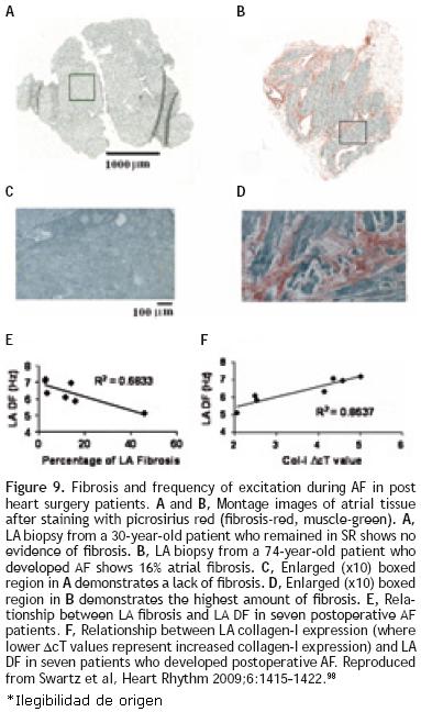 In sum, Increasing amounts of LA fibrosis, particularly from collagenI, are associated with a lower LA DF during AF after cardiac surgery. The accumulation of fibrosis has been found to modify the electrophysiologic properties of the atrium by reducing the velocity of the impulse and providing a substrate for reentry and AF initiation.60,99,100 The finding of reduced DF with increased presence of fibrosis is similar to the reduced frequency of reentry in monolayers with increasing myofibroblasts/myocytes area ratio. Thus, one may speculate that fibrosis in postoperative patients is sufficient to alter the dynamics of an ensuing AF independently of other remodeled factors associated, for example, with age or heart failure.