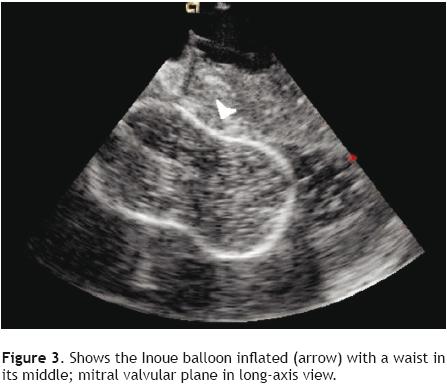 A 65yearold woman with high blood pressure and past medical history positive for rheumatic fever during childhood on ambulatory medical treatment with spironolactone, enalapril, and furosemide presented at our institution, the Instituto Nacional de Cardiologia Ignacio Chavez, with a history of progressive worsening of her functional class over the last 6 years. She was referred to our Institute after detecting a cardiac murmur. A transthoracic echocardiogram showed evidence of inactive rheumatic heart disease, pure mitral valve stenosis with a mean transmitral valve pressure gradient of 15 mmHg, and dilatation of the left atrium of 47 mm. In addition, there was evidence of mild mitral valve, tricuspid valve, and aortic valve regurgitation, as well as pulmonary artery hypertension with a pulmonary artery systolic pressure calculated at 62 mmHg. Left ventricular ejection fraction was normal (70%). Echocardiography Wilkins score was calculated at 6 and the patient was considered for percutaneous mitral valvuloplasty with the Inoue balloon.