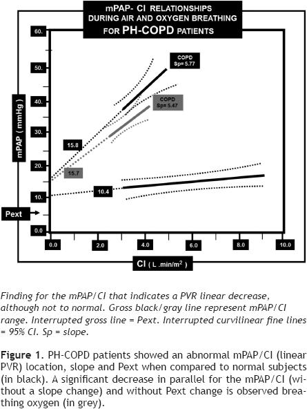 Although, COexercise changes may led to spurious increased slopes in some PH patients, we demonstrate that when mPAP/CI are constructed according to the logistic provided and the derived information is analyzed in relation to PH pathogenesis, mPAP/CI could give a valuable information regarding the true linear PVR nature. We also found that mPAP/CI abnormalities, due to the influence of active/passive factors related to PH pathogenesis, could not only reflect precisely increased "true PVR for small muscular arteries/arterioles" in all the hemodynamic spectrum for PH COPD. We should focus on resting mPAP values for PH COPD patients, because for those with a resting <30 mmHg mPAP could probably benefit more with LTOT by in addition reducing RV afterload, hemodynamic condition which in turn should give a better longterm prognosis for this category PH COPD patients.