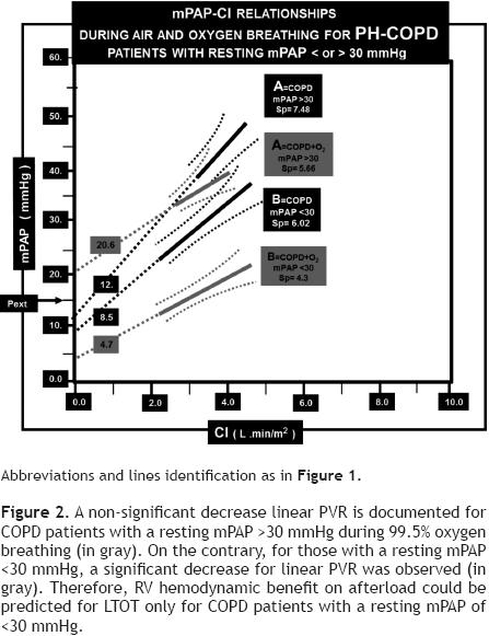 Due to the meaningless significance of calculated pulmonary vascular resistance (PVR),1 a bedside approach to get a deeper insight into the PVR linear component nature is based on the determination of multipoint mean pulmonary artery pressure (mPAP) cardiac index (CI) relationship.25 In most cardiac/pulmonary diseases mPAP/CI are well described by a linear approximation, but their extrapolation to the pressure axis at zero flow (Pext) may be higher than pulmonary artery occluded pressure or left atrial pressure.1,2,5 An increased Pext could be explained by an increased mean closing pressure in small arterioles or capillaries (or both), or also could result from the forces on the outside of the vessels, such as abnormal alveolar pressure on the pulmonary capillaries.611 Approach for PVR determination, that from time to time had been attempted in cohorts composed by few cases with pulmonary hypertension (PH) due to lung diseases in the last 40 years. Although, to our knowledge this hemodynamic approach has not been attempted to evaluate the acute role of oxygen according to mPAP level in PH chronic obstructive pulmonary disease (COPD) patients.35 Information that could be important, since it has been suggested that when resting mPAP is moderately to markedly elevated (>30 mmHg) at the onset of longterm oxygen therapy (LTOT), the survival rate is decreased in comparison with patients with no or mild PH (<30 mmHg).1217 Accordingly, it has been proposed that LTOT should be started earlier at the stage of mild (or even absent) PH to favor the longterm survival in hypoxemic COPD patients.15