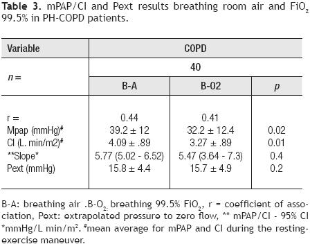 Conclusiones: Cuando se analiza la PAPm/IC, se obtiene información que es valiosa para interpretar la resistencia vascular pulmonar linear en sujetos con EPOC e H P. Sin embargo, las anormalidades de la PAPm/IC, no necesariamente reflejan aumento exclusivo de la resistencia arteriolar pulmonar para sujetos con EPOC e H P. De acuerdo con las observaciones agudas de este estudio, posiblemente solo sea de esperarse beneficio con la oxigenoterapia a largo plazo sobre la circulación pulmonar y la postcarga del ventrículo derecho, para aquellos portadores de EPOC e HP cuando la PAPm en el reposo sea <30 mmHg.