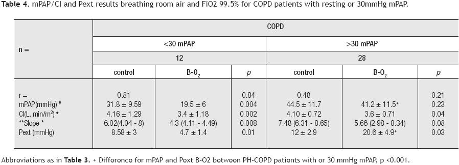 When COPD patients were separated in those with resting or 30 mmHg mPAP, for the first cohort it was noted a significant decline in averagemPAP (12.3 mmHg, p <0.004) associated with a significant slope decrease (p <0.008), a downward mPAP/CI 95% CI displacement and a Pext decrease in relation to breathing room air. For the >30mmHg mPAP group, a nonsignificant decrease for the averagemPAP (3.3 mmHg, p = 0.23) with no change for the mPAP/CI 95% CI location, associated with a slope trend to decrease and an increase in Pext in relation to breathing room air was documented.