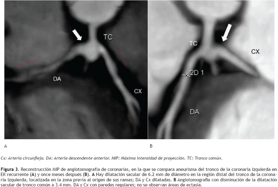 En este paciente se corroboró dilatación de ambas coronarias, aneurisma de 6.2 mm en la bifurcación de la coronaria izquierda e isquemia miocárdica ratificada con gammagrama cardiaco; un año después del evento la isquemia remitió y el tamaño del aneurisma disminuyó significativamente.