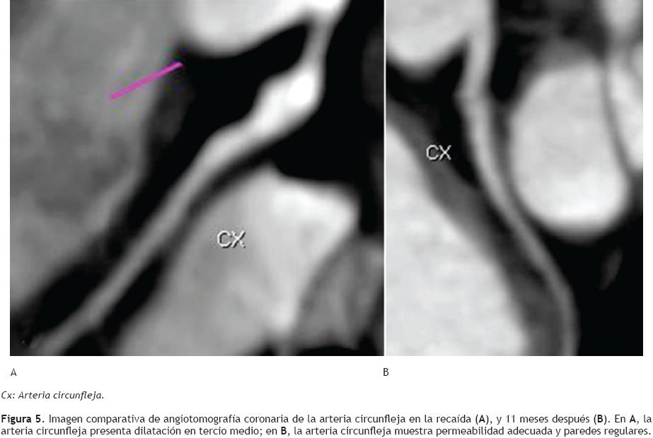 Un año después del primer evento, la angiotomografía de arterias coronarias no mostró alteraciones de las arterias descendente anterior izquierda, coronaria derecha y circunfleja; hubo disminución del aneurisma en tronco común a 3.4 mm (Figuras 3 a 5) (4). Los estudios de laboratorio sin alteraciones y el gammagrama perfusorio miocárdico de control sin evidencia de infarto ni de isquemia. El paciente se encuentra asintomático, no ha presentado reactivación de la enfermedad y continua tratamiento con ácido acetilsalicílico.