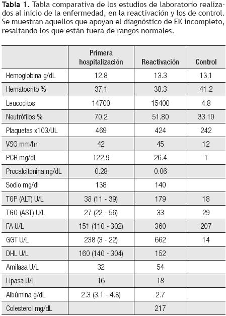 Se inició tratamiento con gammaglobulina endovenosa a 2 g/kg, remitiendo los síntomas en 48 horas. El ecocardiograma mostró diámetro de coronarias en percentil 90 para su edad, sin aneurismas. Cinco días después de la administración de gammaglobulina endovenosa, se egresó asintomático y con tratamiento esteroide (prednisona 0.5 mg/kg/d) y acetazolamida (8 mg/kg/d). El ultrasonido de abdomen realizado una semana después del egreso, mostró disminución del tamaño de vesícula biliar a 4.9 cm por 1.6 cm por 1.6 cm. Al disminuir gradualmente el esteroide, en un periodo de dos semanas, hubo reactivación de los síntomas, presentando hiperemia conjuntival, hiporexia, cefalea, fiebre de 38.3°C y artralgias, agregándose dolor abdominal de predominio en hipocondrio derecho, fue hospitalizado para realización de estudios.