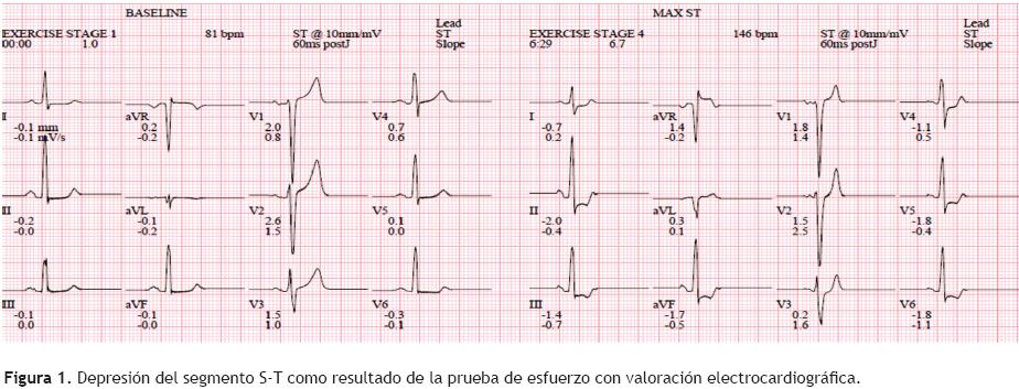 PM, abogado de 38 años, acude a consulta por presentar episodios de dolor precordial de tres meses de evolución. El dolor es de tipo opresivo, irradiado al cuello y espalda, de 20 minutos de duración. El dolor está relacionado con el esfuerzo físico, cede con el reposo y en otras ocasiones mediante la ingesta de alimentos lácteos. Ocasionalmente le ocurre al acostarse. Tiene historia personal de reflujo gastroesofágico diagnosticado hace seis meses, el cual trata con antiácidos por razón necesaria. No tiene historia personal de hipertensión, tabaquismo, dislipidemia, diabetes o programa de ejercicio regular. En el examen físico: presión arterial: 126/86 mmHg, pulso: 70, peso: 92 kg, estatura: 1.72 m, índice de masa corporal: 31 kg/m2, circunferencia de cintura: 96 cm. Es un varón con obesidad abdominal. No hay distensión venosa yugular ni soplos carotideos. Los ruidos cardiacos rítmicos y regulares, sin S3, S4 o soplos. Resto del examen físico sin datos relevantes. El ECG en reposo fue normal. Se decide realizar una prueba de esfuerzo con valoración electrocardiográfica (Figura 1), como parte del estudio de su cuadro actual para investigar una posible etiología coronaria. Permaneció nueve minutos en el protocolo de Bruce, sin desarrollar dolor precordial. Alcanzó una FC de 160, 87% de frecuencia máxima estimada para su edad. Respuesta de presión arterial normal. En el ECG, se observó una depresión del segmento ST de 1.5 mm por debajo del nivel basal a 0.08 segundos después del punto J al esfuerzo máximo. Estos cambios desaparecieron durante el primer minuto de la recuperación. Con estos datos: ¿Cuál es la probabilidad de una estenosis coronaria significativa como responsable de su dolor?