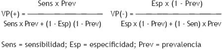 Un método alternativo para calcular los valores predictivos de la prueba es utilizando la fórmula de Bayes, por lo que se requiere el conocimiento previo de la sensibilidad y especificidad de la prueba diagnóstica, además de la prevalencia de la enfermedad, y se la obtiene de la siguiente manera: