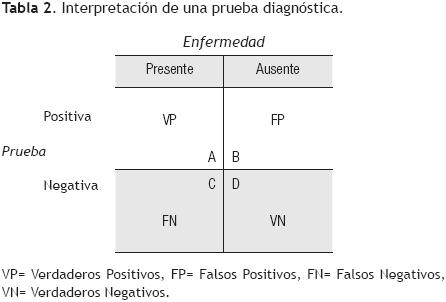 Para mejor el entendimiento de la obtención de los criterios principales de la validez de una prueba diagnóstica tomamos como referencia una tabla de dos por dos. (Tabla 2).