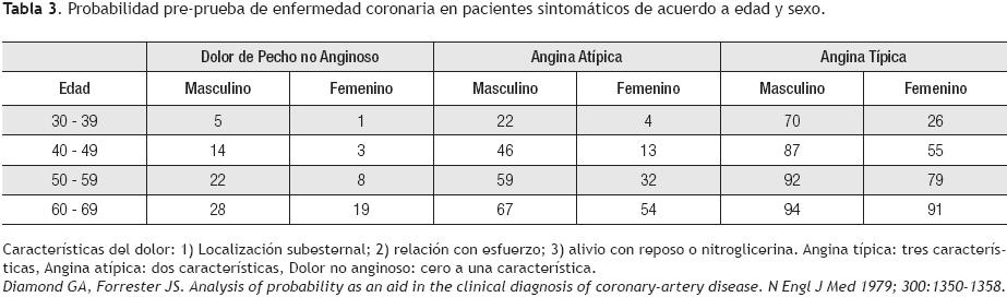 Nos encontramos frente a un paciente con cuadro clínico con ciertas características atípicas de angina de pecho, que de acuerdo con su edad, sexo y síntomas, se estima una probabilidad intermedia baja que tenga enfermedad coronaria oclusiva. La prueba de esfuerzo con valoración electrocardiográfica mostró depresión significativa del segmento ST (1.5 mm), que catalogó la prueba como positiva. Si conocemos que la prevalencia de enfermedad coronaria en sujetos de 30 a 39 años con angina atípica es de 22% (Tabla 3) con una sensibilidad y especificidad de la prueba de esfuerzo de 60% y 85% respectivamente, el VP+ es 53%, es decir que hay una probabilidad de 53% de que el paciente tenga estenosis coronaria significativa.11,12 Si bien hay un aumento del doble de la probabilidad pre a postprueba, continua siendo un valor ambiguo para confirmar el diagnóstico. Por otro lado, utilizando la sensibilidad y especificidad de la prueba se obtuvo una razón de probabilidad positiva (RP+) = 4 (Apéndice 1). De igual manera aplicando el método simplificado de razón de probabilidad correspondería a un incremento de probabilidad postprueba de 25% (22 + 25 = 47%). Lo que nos llevó a encontrar otra prueba diagnóstica con una mayor certeza para confirmar o descartar la posibilidad de que el paciente padezca la enfermedad. El paciente se sometió a una angiografía coronaria donde no se demostró oclusión coronaria significativa. Subsecuentemente, se realizó una medición ambulatoria de pH esofágico, que mostró presencia de acidez esofágica que coincidió con los episodios de dolor precordial al esfuerzo. El paciente fue tratado con inhibidores de la bomba de protones de manera intensiva, y no ha tenido recurrencia del dolor. El Apéndice 2 muestra valores de razón de probabilidad en el diagnóstico de enfermedad coronaria oclusiva.