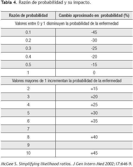 Muchas veces estos procesos matemáticos resultan tediosos en la vida práctica, por lo que otra forma eficaz y simple de utilizar la razón de probabilidad es la propuesta por McGee, donde primero se necesitan recordar tres valores de razón de probabilidad como son dos, cinco y 10 que corresponderán a un incremento de la probabilidad de 15%, 30% y 45% (múltiplos de 15). Para valores menores a uno, la regla es el valor recíproco, tomando como ejemplo, una razón de probabilidad de dos correspondería a ½ = 0.5 que disminuiría la probabilidad 15%.10 De la misma forma, 1/5 = 0.2 el cual disminuye la probabilidad 30%, y 1/10 = 0.1 que baja la probabilidad 45% (Tabla 4).