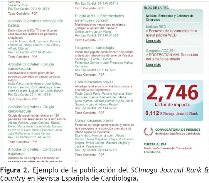 La necesidad de contar con un índice comparativo entre la calidad de las revistas, hizo surgir en su momento al Impact Factor (generalmente referido en español como factor de impacto, el uso de la palabra en español, es por lo menos cuestionable en este contexto; además, nos referiremos a este índice por su denominación en inglés ya que trata de un nombre propio y registrado). Desafortunadamente sólo tres revistas de este grupo cuentan con Impact Factor, Revista Española de Cardiología, Arquivos Brasileiros de Cardiologia y Revista Portuguesa de Cardiología. Surge entonces la necesidad de contar con un índice alternativo para poder comparar nuestras revistas. Se propone que en cada revista se incorpore en su página web su puntuación de SCImago Journal Rank & Country (SJR). Este indicador se basa en el algoritmo de Google Page Rank y está disponible para todas las revistas que figuren en Scopus (que son muchas más de las que figuran en el Citation Journal Reports de ISIThomson). Este índice de trascendencia, está disponible para un mayor número de revistas de nuestra red, incluyendo Revista Española de Cardiología, Archivos de Cardiología de México, Arquivos Brasileiros de Cardiologia, y Revista Argentina de Cardiología. Archivos de Cardiología de México y Revista Española de Cardiología ya han dado un paso en este sentido al incluir en su página de "legales" el índice de trascendencia correspondiente. El formato adoptado por Archivos de Cardiología de México incluye descripción en el índice con una pequeña leyenda abajo que reza "Para comparar con otras revistas, visite: www.scimagojr.com (Figura 1).En esta página se pueden obtener los índices de todas las revistas y el sitio web permite hacer comparaciones directas entre revistas en general, entre revistas de la especialidad e incluso entre revistas de un mismo país. En el caso de Revista Española de Cardiología han optado por presentar su índice al lado del Impact Factor (Figura 2).
