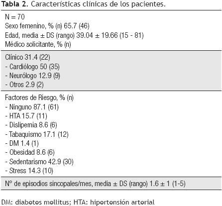 El estudio incluyó 70 pacientes, cuyas características clínicas se muestran en la Tabla 2. De las PI, 21 (30%) fueron positivas, seis (28.5%) presentaron respuesta mixta y 15 (71.5%) respuesta vasodepresora.