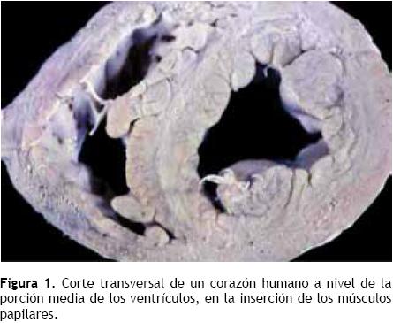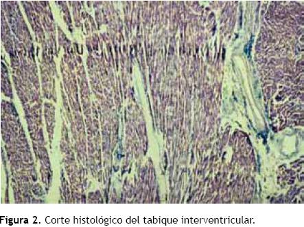 Las Figuras 1 y 2, correspondientes a un corazón humano, proporcionan un ejemplo de lo antes dicho. En la Figura 1, el tabique interventricular muestra un fascículo central, que divide claramente las dos porciones de miocardio septal: derecha e izquierda. Dicho fascículo se dispone longitudinalmente, mientras que las fibras miocárdicas septales, pertenecientes a ambos ventrículos, son transversales o tangenciales respecto a él. Un corte histológico del tabique interventricular (Figura 2) permite ver un fascículo central de tejido miocárdico en disposición longitudinal. A ambos lados de éste, las fibras miocárdicas cambian de dirección y se disponen en forma oblicua o perpendicu lar respecto a las centrales longitudinales. Hay delgados tabiques de tejido conjuntivo vascularizado entre los fascículos (hematoxilinaeosina, 4x).