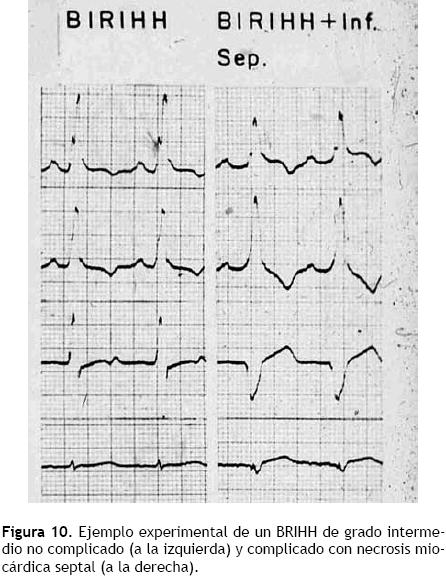 La Figura 10 exhibe un ejemplo experimental de las manifestaciones eléctricas de un BRIHH de grado intermedio no complicado con necrosis miocárdica y complicado con una zona de miocardio inactivable anteroseptal (Inf. Sep.). Por efecto de este daño miocárdico, se reduce la meseta intermediaempastada de la onda r en las derivaciones unipolares izquierdas y de las curvas vectocardiográficas ventriculares.