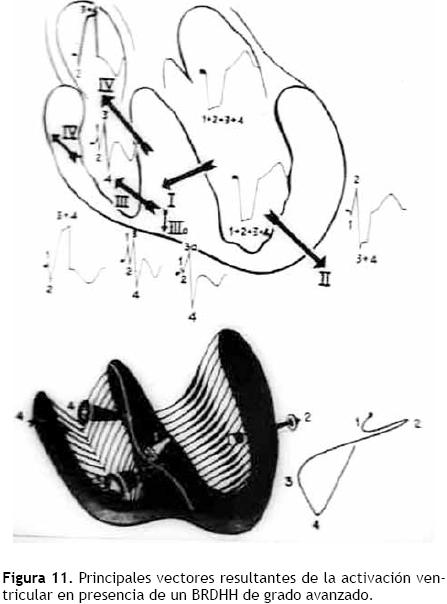 Cuando existe un BRDHH de grado avanzado, a saber con "salto de onda" extenso a lo largo de la barrera intraseptal, el sentido general de la activación ventricular es de izquierda a derecha y de abajo hacia arriba. las fuerzas electromotrices más importantes de los procesos de despolarización y repolarización ventriculares, son las septales que duran más. Se establece así una neta preponderancia eléctrica del tabique interventricular sobre las paredes libres ventriculares. La sucesión del proceso de activación ventricular puede representarse por cuatro vectores resultantes principales, como se indica de manera esquemática en la Figura 11. El primer vector de la activación ventricular se origina en la masa septal izquierda media y se dirige hacia delante y a la derecha con mayor manifestación respecto a la normal. El vector 2, resultante de la activación de la pared libre del ventrículo izquierdo y dirigido hacia la izquierda, tiene una manifestación reducida porque resulta contrarrestado por los frentes de activación que efectúan el "salto" de izquierda a derecha en porciones inferiores del tabique interventricular. El vector 3 se orienta hacia la derecha y adelante porque constituye el vector resultante del "salto de onda" en regiones septales bajas. El vector 4, orientado hacia la derecha y más adelante, resulta del fenómeno de "salto de onda" de izquierda a derecha en porciones superiores del tabique interventricular. las fuerzas electromotrices septales, que son las más importantes de la despolarización y la repolarización ventriculares, pueden resumirse en dos vectores resultantes de igual magnitud y sentido opuesto (Figura 12): el de la despolarización, dirigido de izquierda a derecha y de abajo hacia arriba; el de la repolarización, orientado de derecha a izquierda, entre 0° y 10°. El complejo intraventricular derecho adquiere una configuración en "M" o más polifásica, con TIDI >40 mseg.
