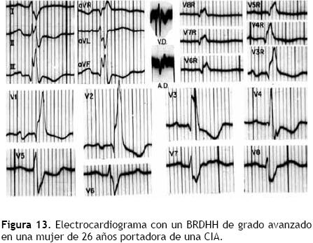El ECG de la Figura 13 brinda un ejemplo de BRDHH de grado avanzado en una mujer de 26 años con CíA.