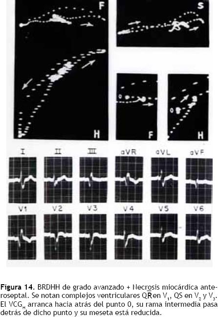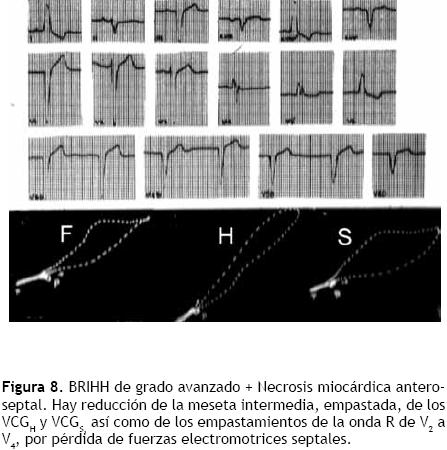 A causa de un bloqueo de rama derecha (BRDHH) de grado avanzado, con "salto de onda" extenso, también se originan fuerzas electromotrices septales predomi nantes. La coexistencia de una zona de miocardio inactivable anteroseptal con un BRDHH de grado avanzado hace que el "salto de onda" de izquierda a derecha comience en porciones posteroseptales bajas. Así los electrodos de las derivaciones transicionales ven alejarse los primeros frentes del "salto de onda" y registran: ondas Q. Una zona inactivable parietal derecha, transmural, permite a los electrodos externos correspondientes registrar la morfología polifásica del complejo intraventricular homolateral. Un BRDHH de grado intermedio, asociado a necrosis anteroseptal, se caracteriza por reducción de los signos de bloqueo y presencia de ondas Q en las derivaciones precordiales derechas y transicionales.
