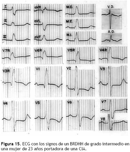 El ECG muestra empastamientos positivos, i. e. de la onda R, en todas las derivaciones que exploran el corazón derecho y empastamientos negativos, i. e. de la onda S, en aquellas que miran hacia el ventrículo izquierdo. El TIDI fluctúa entre 35 y 45 mseg en las derivaciones transicionales, lo que refleja el retardo de la despolarización de la masa septal derecha anteroinferior. El TIDI es de alrededor de 80 mseg en aVR y pueden registrarse ondas T invertidas, de tipo secundario, en las derivaciones derechas. A su vez, el TIDI está comprendido entre 25 y 40 mseg en el complejo intraventricular derecho bajo. La Figura 15 proporciona un ejemplo de BRDHH de grado intermedio en una mujer de 23 años con una CIA (TIDI= 35 mseg en V3 y V4).