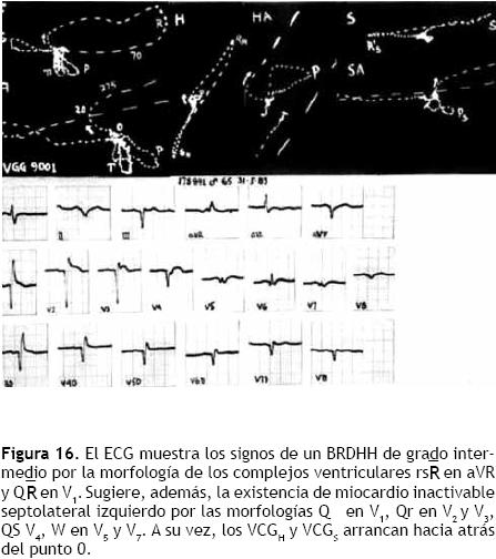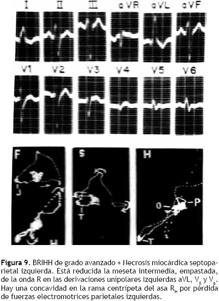Los registros eléctricos de la Figura 9 revelan la existencia de un BRIHH de grado avanzado por los empastamientos de las ondas R en las derivaciones electrocardiográficas izquierdas y de la meseta intermedia, empastada, de las curvas vectocardiográficas ventriculares. La presencia de una zona de miocardio inactivable septal se sugiere por la reducción de la meseta de la onda R en las derivaciones DI, aVL, V5, V6 y de las curvas vectocardiográficas ventriculares. La concavidad en la rama centrípeta del asa R H hace pensar en la existencia de miocardio inactivable en regiones laterales de la pared libre del ventrículo izquierdo.