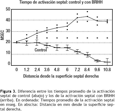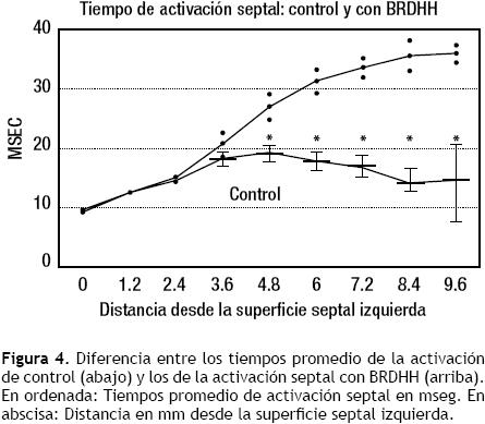 b. Datos eléctricos: los hallazgos obtenidos en una investigación experimental realizada en nuestro Instituto8 sustentan el concepto de una bipartición histológica y funcional del tabique interventricular en animales de laboratorio y probablemente también en corazones humanos. Ambas masas septales, izquierda y derecha, reciben de manera independiente los impulsos de activación, cada una por el sistema de conducción correspondiente. De hecho, la activación septal no es de tipo sincicial. Si hay un obstáculo en un sistema de conducción ventricular, la di rección y la orientación del proceso de despolarización septal se modifican y, por ende, cambian los aspectos cronológicos y morfológicos de los complejos intra y extraventriculares. La Figura 3 indica la diferencia entre los tiempos promedio de la activación septal de control y los de la activación con BRIHH, la que se vuelve significativa a la profundidad de 2.4 mm desde la superficie septal derecha (RSS). Por su lado, la diferencia entre los tiempos promedio de la activación septal de control y los de la activación con BRDHH se vuelve significativa a la profundidad de 4.8 mm desde la superficie septal izquierda (lSS), Figura 4. Esto confirma que, en el tercio medio del tabique interventricular, en el corazón canino, la "barrera intraseptal" se halla más cerca de la superficie septal derecha probablemente por el mayor espesor de la masa septal izquierda en dicha zona.