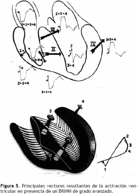 Puede decirse que, en presencia de un BRIHH de grado avanzado, las fibras de la red de Purkinje izquierda comienzan a activarse después del principio de la activación de la masa septal derecha.9 El sentido general del proceso de despolarización ventricular es de derecha a izquierda. La sucesión del fenómeno puede representarse por cuatro vectores resultantes principales (Figura 5). En resumen, el primer vector septal derecho se dirige hacia delante y abajo; el segundo vector, resultante del "salto de onda" en porciones inferiores del tabique interventricular, se dirige hacia la izquierda y muy atrás; el tercer vector, resultante del "salto de onda" en regiones superiores de dicho tabique, se dirige hacia la izquierda y menos atrás que el vector 2; el cuarto vector resultante de la activación de regiones laterales izquierdas basales, se orienta hacia la izquierda y aún menos atrás que el tercero.
