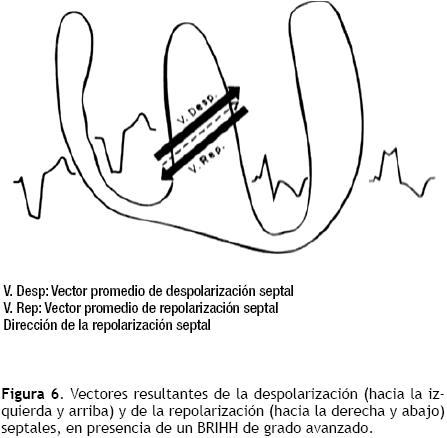 Principales vectores resultantes de la activación ventricular. Cuando existe este tipo de bloqueo troncular,9 el primer vector en manifestarse se origina en la masa septal derecha baja, y se dirige hacia de lante y a la izquierda. En las derivaciones que exploran el corazón izquierdo las ondas r tienen el vértice empastado o una meseta, con tiempo de inicio de la deflexión intrinsecoide (TIDI) de 80 mseg o más. En una derivación transicional, p. ej. V4, pueden registrarse complejos ventriculares en M, en los que la primera positividad corresponde al primer vector septal derecho y la segunda a un vector septal izquierdo local. El complejo intraventricular izquierdo muestra una deflexión positiva inicial, correspondiente a los frentes del "salto, de onda", la que es igual o mayor respecto a la deflexión negativa que le sigue (onda S). En general, el voltaje de la onda r no aumenta en las derivaciones precordiales izquierdas a menos que coexista hipertrofia del ventrículo homolateral. La onda T es negativa, de tipo secundario, en las derivaciones que exploran el corazón izquierdo a causa de la oposición de los vectores resultantes septales (Figura 5).