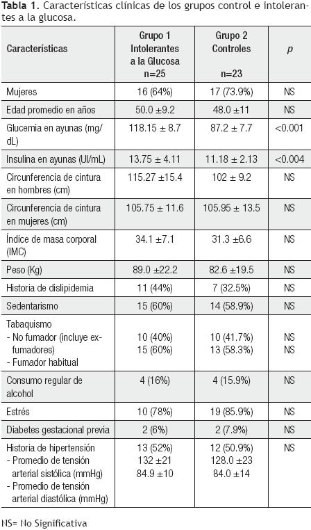 De los 48 participantes consecutivos incluidos en este estudio, 25 tuvieron glucemia alterada en ayunas y PTOG anormal, e integraron el grupo uno, intolerantes a la glucosa. Por otra parte, 23 tuvieron glucemia en ayunas y PTOG normal, éstos constituyen el grupo dos, sujetos controles. Las características clínicas de ambos grupos fueron comparables (Tabla 1).
