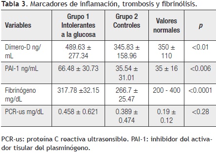 En el grupo uno (intolerantes a la glucosa), las concentraciones sanguíneas investigadas de biomarcadores de trombosis: dímero-D y fibrinógeno fueron significativamente superiores, respecto al grupo 2 (controles) (p<0.01 y p<0.0001 respectivamente), y el biomarcador de fibrinólisis (PAI-1) también fue significativamente mayor, respecto al grupo dos (controles), (p<0.006) (Tabla 3).