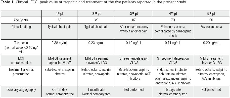 In the two oldest patients, coronary angiography was not performed (cases 3 and 5), so that uncertainty persists about real exclusion of atheromatous coronary disease; however both the patients had fast resolution of wall motion abnormalities that involved the mid apical segments of the left ventricle with an extension that was out of proportion to the ECG changes and to the slight increase of troponin and CK-MB. In acute myocardial infarction, we do not expect resolution of wall motion abnormalities without coronary reperfu-sion by trombolysis or coronary angioplasty.