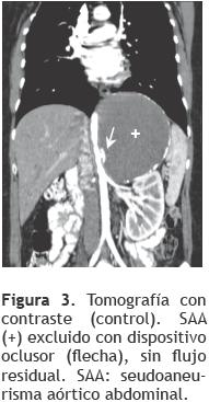 Ante la necesidad de una cirugía compleja, se decidió como alternativa el abordaje endovascular, previo consentimiento informado. Bajo anestesia general, colocamos introductor en arteria femoral derecha, para colocación inmediata de balón en aorta, en caso de ruptura accidental de la misma o del SAA. Utilizando el acceso arterial braquial izquierdo (técnica de Sones), localizamos el cuello del SAA, mediante aortografía abdominal con catéter angiográfico. Luego, sobre guía metálica con punta blanda de 0.035'' x 260 cm introducida en el interior del SAA, intercambiamos el catéter JR 5Fr, por catéter con balón de medición, valorando por angiografía cuantitativa que el diámetro del extremo aórtico del cuello medía 6 mm. Seguidamente, sobre la misma guía metálica intercambiamos una vaina tipo Mullins 7Fr, a través de la cual se avanzó un dispositivo Amplatzer-ASD 6 mm (AGA medical corporation®, USA), que se posicionó en el cuello del SAA. La aortografía inmediata de control, evidenció flujo residual leve (Figura 2B), no hubo compromiso de vasos viscerales, ni gradiente aórtico generado por el dispositivo.