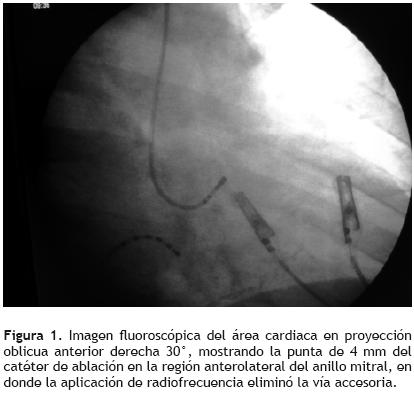 Tras un test de Allen normal, el paciente consintió en una ablación por vía transradial. Bajo sedoanalgesia con midazolam y fentanyl, manteniendo una infusión de nitroglicerina, previa anestesia local con lidocaína, se canalizó la arteria radial derecha, con una aguja 18G y cuerda metálica 0.35 x 45 cm, sobre la cual se pasó un introductor hemostático 7Fr. Simultáneamente, se canalizó la vena femoral derecha con un sólo introductor 6Fr para insertar un catéter de registro decapolar en el seno coronario. A continuación, se administraron 3 000 unidades de heparina sódica por vía sistémica. A través del introductor radial se insertó un catéter de ablación Livewire TC 7Fr, small curl, SJM, punta 4 mm, el cual se avanzó hacia la aorta ascendente y a través de la válvula aórtica hasta el anillo mitral para su mapeo. En posición oblicua anterior derecha 30°, se posicionó el catéter en la región anterolateral del anillo, en donde la activación ventricular precedía a la onda delta por 8 ms, aplicándose la radiofrecuencia mediante un generador IBI (Irvine Biomedical®, SJM), con control de temperatura a 70°C, máxima potencia de 50W, eliminándose la conducción de la vía antes de cinco segundos (Figura 1). La aplicación se prolongó por 100 segundos y se retiró el catéter de la zona.