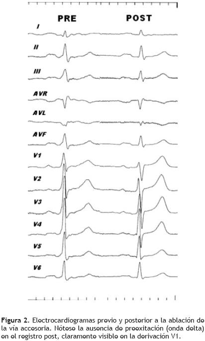 El éxito de la ablación se confirmó por la desaparición de la onda delta en el electrocardiograma de superficie (Figura 2) y la presencia de conducción decremental durante la estimulación desde seno coronario. Finalmente, se avanzó el catéter de seno coronario al ventrículo derecho, y el de ablación a la cúspide aórtica no coronaria para registro del potencial del haz de His, verificándose la ausencia de conducción retrógrada. Estos hallazgos se mantuvieron hasta 15 minutos después de la aplicación efectiva, cuando se dio por concluido el procedimiento. Se retiró el introductor arterial, realizando compresión intensa por 20 minutos y se colocó un apósito fuertemente compresivo que se mantuvo por seis horas, con la muñeca inmovilizada. El tiempo total de duración del procedimiento fue de una hora con 18 minutos, con un tiempo de fluoroscopía de siete minutos.