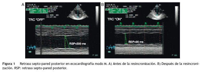 Cuando existe un trastorno de conducción intraventricular, típicamente un bloqueo de rama izquierda, la activación de la pared libre ventricular izquierda y su contracción están retrasadas, mientras que la activación y contracción del septo no lo están. Esa descoordinación provoca la llamada discinesia septal o movimiento paradójico septal, en el cual el septo se aleja de la pared libre durante la sístole3. Este fenómeno contribuye a empeorar el funcionamiento dinámico de la válvula mitral, y reduce la contribución de la contracción septal al volumen sistólico ventricular izquierdo. A pesar de que existen métodos ecográficos muy sofisticados para cuantificar este fenómeno, en muchos casos la apreciación de este es obvia, simplemente mediante un corte ecocardiográfico modo M en el plano paraesternal eje corto, observándose un retraso entre la máxima excursión del septo y de la pared posterior (fig. 1). Los trastornos de conducción también pueden afectar a la sincronización de la sístole de ambos ventrículos (desincronía interventricular). Mediante ecocardiografía puede apreciarse este fenómeno como la diferencia entre el retraso electromecánico del ventrículo derecho (tiempo en ms desde el inicio del QRS al inicio del flujo pulmonar), y el izquierdo (tiempo en ms desde el inicio del QRS al comienzo del flujo aórtico).
