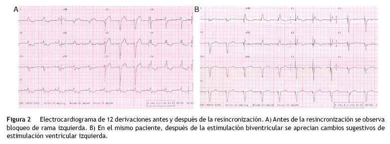 Desde el punto de vista electrocardiográfico, los pacientes sometidos a terapia de resincronización cardiaca pueden presentar diversos patrones. En general, tiende a observarse una desviación del eje hacia la derecha, con complejos QRS negativos en derivaciones I y aVL, morfología de bloqueo de rama derecha (fuerzas iniciales en V1 positivas), y duración del complejo QRS relativamente estrechos para tratarse de pacientes sometidos a estimulación eléctrica4 (fig. 2).