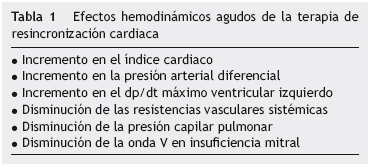 En los pacientes con disfunción ventricular izquierda, insuficiencia cardiaca avanzada y signos de desincronía, comúnmente detectados por una prolongación en la duración del complejo QRS, se observa una serie de efectos hemodinámicos agudos beneficiosos tras la resincronización (tabla 1). Además, uno de los efectos más consistentes de la terapia de resincronización cardiaca es la disminución de la insuficiencia mitral funcional, muy frecuente en pacientes con dilatación y disfunción ventricular izquierda y trastornos de la conducción intraventricular. La disminución de la insuficiencia mitral, tanto en su componente presistólico como sistólico, asociada a la resincronización contribuye a su beneficio clínico. Es importante recalcar que estos efectos beneficiosos observados en estudios hemodinámicos agudos, se acompanñan de una disminución en la frecuencia cardiaca y en el consumo miocárdico de oxígeno, lo cual es importante desde el punto de vista pronóstico.