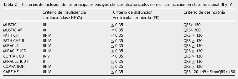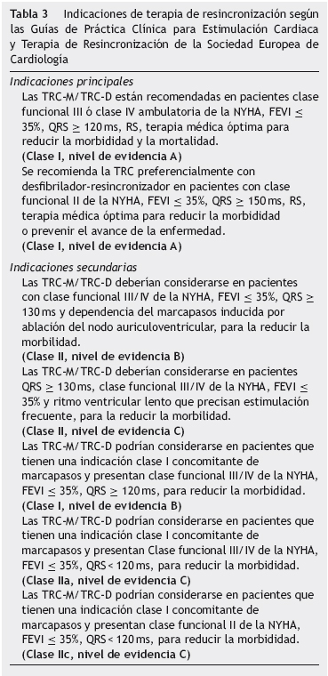 Desde el añno 2002, las guías de práctica clínica tanto europeas como americanas aceptan la terapia de resincronización cardiaca como un tratamiento probadamente eficaz para el tratamiento de pacientes con insuficiencia cardiaca refractaria en grado funcional III o IV de la NHYA de cualquier etiología, disfunción sistólica ventricular izquierda con fracción de eyección inferior a 0.35, y signos de desincronía comúnmente detectados como una prolongación de la anchura del complejo QRS17,18 (tabla 2).