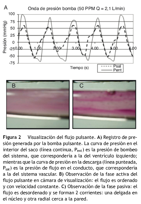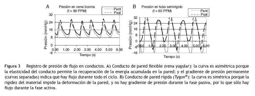 Métodos: Utilizando un dispositivo de bombeo tipo saco elástico de accionamiento neumático, se procedió a la observación visual e instrumental del flujo a través de conductos tanto flexibles (vaso venoso bovino) como rígidos (tubo plástico), y se analizaron las características biomecánicas de la pulsación en ambos.