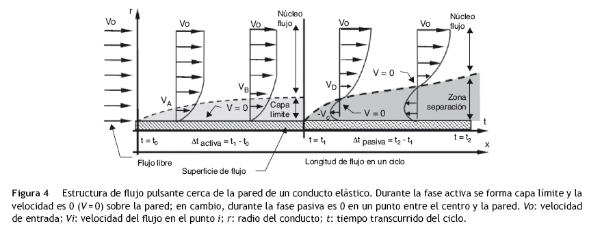 Cuando el fluido es impulsado por una presión periódica (pulsante), se desarrolla un patrón de flujo en cada fase del ciclo. Durante la aplicación de presión (fase activa), el flujo es dominado por las fuerzas inerciales convectivas, produciendo una corriente central en dirección axial que ocupa casi toda el área de flujo, y formación de capa límite (fig. 4). En cambio, cuando cesa la aplicación de presión (fase pasiva), el desequilibrio súbito entre las fuerzas inerciales convectivas y las viscosas genera fuerzas inerciales transitorias, que a su vez provocan la aparición de una corriente secundaria caracterizada por tener dirección radial y velocidad en sentido contrario a la dirección de la corriente principal. Esta corriente secundaria frena el avance del fluido, causando la separación de la corriente aún en presencia de un gradiente de presión favorable. Así, la corriente secundaria frena el fluido tanto en el núcleo de flujo como en la capa límite. Como el flujo axial se va desvaneciendo en la fase pasiva, la velocidad llegaa0en un punto entre el centro de flujo y la pared del conducto, y no sobre la pared, propiciando la separación de la corriente (ver puntos con velocidad 0 [V =0] en fase pasiva) (fig. 4). El efecto de las fuerzas inerciales transitorias en la fase pasiva es entonces, el de la formación de 2 corrientes: una axial residual en el centro, que continua avanzando por el impulso acumulado en la fase activa anterior, y otra radial dominante en la periferia del conducto, que retarda el flujo y provoca la separación.