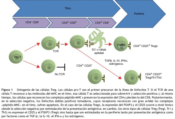 Las células Treg son una subpoblación de linfocitos T CD4+ cuyas funciones primordiales y más estudiadas son la supresión de la respuesta inmune y el mantenimiento de la tolerancia a los autoantígenos. Estas células expresan de manera constitutiva marcadores que no son exclusivos de este linaje celular. Recientemente se ha incorporado FOXP3 como un marcador fenotípico característico de las células Treg, ya que en estas se expresa de manera elevada y sostenida, además de ser un factor crítico para el desarrollo y función de esta clase de linfocitos.