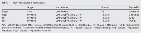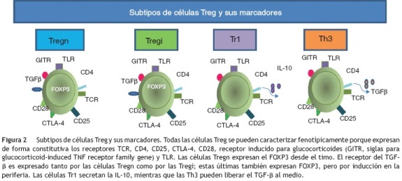Se han descrito diferentes tipos de células reguladoras (tabla 1); las células Tr1 son un tipo de células Th dependientes de la interleucina (IL)-10 para su diferenciación, y algunas de sus propiedades reguladoras no expresan el FOXP3, pero al igual que las células T reguladoras naturales (Tregn), que son las que provienen del timo como células T CD4+CD25+FOXP3+, tienen alta expresión del CD152 en la superficie y pueden activar a la indolamina-2,3-dioxigenasa (IDO)21. Las células Th3 se caracterizan por la producción del factor de crecimiento transformante beta (TGF-β, siglas de transforming growth factor beta) y dependen de este para su diferenciación; además, expresan la cadena alfa del receptor de la IL-2 (CD25) como las células Tregn22. Otra población de células Treg son las inducidas (Tregi); estas tienen expresión de FOXP3 inducida en la periferia23.