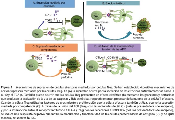 Se han propuesto diferentes mecanismos de acción por los cuales las células Treg median la supresión de las células efectoras (fig. 3); dentro de los principales están: a) un mecanismo dependiente de las citocinas, especialmente de la IL-10 y del TGF-p, en el que los factores solubles con características antiinflamatorias tienen una acción directa sobre la población de las células T efectoras, o bien un efecto inhibidor sobre las células presentadoras de antígeno, induciendo de esta manera una respuesta tolerogénica; b) un mecanismo de eliminación por medio de la vía de las granzimas-perforinas; c) un mecanismo de competencia, en el que las células Treg consumen los factores de crecimiento y supervivencia tales como la IL-2, que induce a la apoptosis de la población de las células efectoras, así como a la interferencia en sus mecanismos de activación; y, finalmente, d) un mecanismo dependiente del contacto celular, a través de la unión del CTLA-4 o el CD28 con sus ligandos CD80 y CD86.