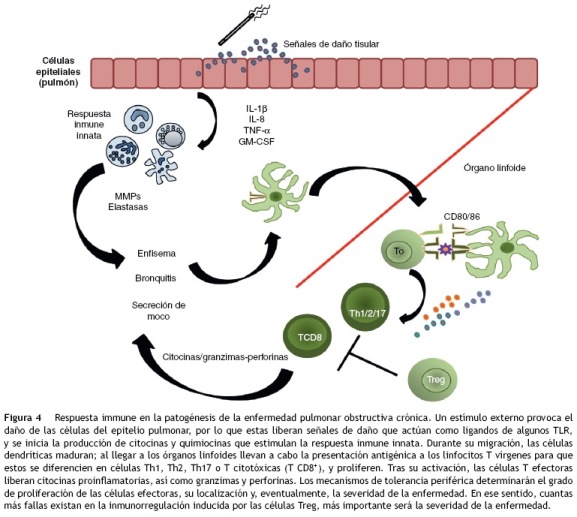 La EPOC se caracteriza por una respuesta inflamatoria exagerada hacia partículas nocivas y gases. El sistema inmunorregulador en la EPOC no actúa de manera eficiente en la prevención del daño pulmonar y de las vías aéreas; por este motivo, hay un predominio de las respuestas proinflamatorias. Se ha demostrado que existe un aumento de las células Treg en la sangre periférica, el LBA y los cortes histológicos de pulmón de pacientes con EPOC, y que el incremento está correlacionado con la gravedad de la enfermedad. Fallas genéticas y epigenéticas podrían explicar la deficiente actividad inmunorreguladora de las células Treg en la EPOC; sin embargo, también es probable que las células efectoras presenten resistencia a ser reguladas; esto debe ser evaluado en trabajos futuros.